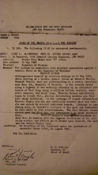Relationship: Older BrotherJerry Lee Houser was my younger brother. I have the medals he was awarded for his bravery and the document telling what happened when he was killed. I would like to send you a copy of it for this tribute. Please tell me how to send it for this record. Thank you.