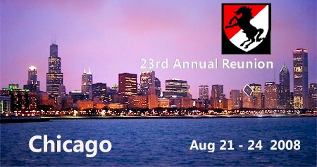 August 21st - 24th, 2008Chicago was the site of the 23rd Annual Reunion of the 11th Armored Cavalry's Veterans of Vietnam and Cambodia. Held at the Hyatt Regency O'Hare this reunion unofficially turned out about 600 members of the 11th ACVVC. Adding to the number were family and friends. By early indications this year's reunion was a huge success.